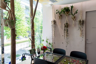 夏を意識して全館をグリーン装飾しました。装飾場所ごとに雰囲気を変え、店外の入り口は赤いハンギングプラントで元気に、店内はエアプランツでボタニカルなイメージにしました。